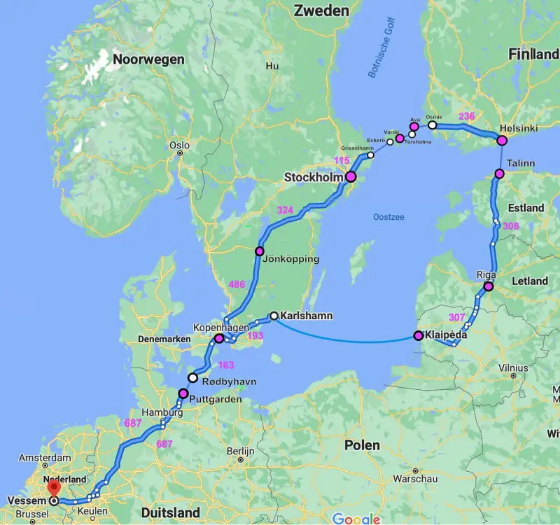 Totaal te rijden kilometers 3620 en ca 22 vaaruren.