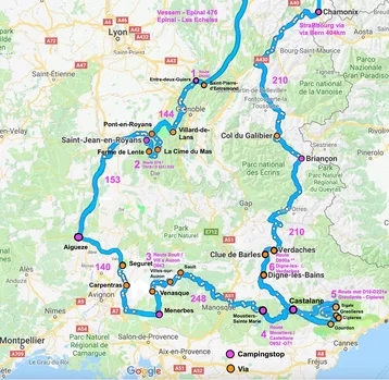 De Route over de D900a, van Digne-les-Bains naar Verdaches hebben wij aan het begin van de ochtend gereden, door de regenval van de voorgaande nacht was de tocht spectaculair door de mist die de omgeving in een diffuus beeld had omgetoverd wat de indruk wekte dat de weg zich door de wolken baande. Tijdens deze route is het verstandig tijdens het Balcony traject het navigatie systeem te negeren omdat dit systeem andere ideeën heeft, en missen we juist de fraaie trajecten. Fraaie stadjes tijdens de route zijn vooral Moustiers de Saint Marie, Algueze, Menerbes, Castalane, Briancon en Chamonix. De omgeving van Chamonix herbergt fraai natuur zoals de Mont Blanc, de gletsjers Mer de Glace welke te bezoeken is met een trein. Een hike naar de Gletsjer des Bossons is een start met een skilift / kabelbaan een mogelijkheid om je aan de voet van de hike af te zetten. Op de camping Mer du Glace wordt een gratis openbaar vervoerkaart verstrekt, de trein naar gletsjer Mer de Glace is echter niet inbegrepen. Het bezoek aan de gletsjer Mer du Glas geeft een inzicht over de klimaatverandering, te zien is in hoe de omvang in ca 100 jaar is afgenomen.
