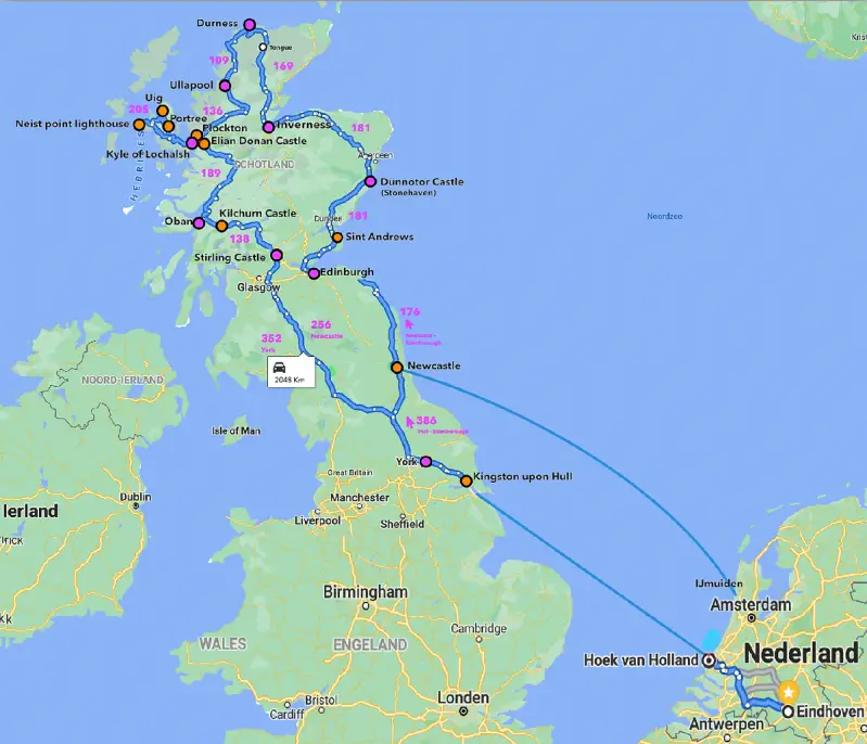 Deze road trip voert door Scotland, Scotland zult je denken daar regent het toch altijd, nee hoor de climate change heeft ook hier toegeslagen. Echter ben ik van mening dat de schotse natuur het fraaist is na een fikse regen of onweersbui en de zon zich weer laat zien dat levert een geweldig plaatje, zeker wat later in de middag als de zon al wat lager staat, en als er in de lucht nog de nodige wolkenpartijen aanwezig zijn. De omstandigheden kunnen ook sterk en kortstondig wisselen, het lijkt soms of je op je wenken bedient wordt. Vanuit Nederland zijn er twee oversteken naar Engeland mogelijk, vanuit Hoek van Holland naar Hull en vanuit IJmuiden naar Newcastle. Zelf zijn wij heen gegaan via Newcastle en terug via Hull, om York nog te kunnen aandoen. Vanuit Newcastle gaat de route naar de eerste bestemming Edenborough, een fraaie oude victoriaanse binnenstad met uitzicht op het kolossale kasteel. We vervolgen onze route naar